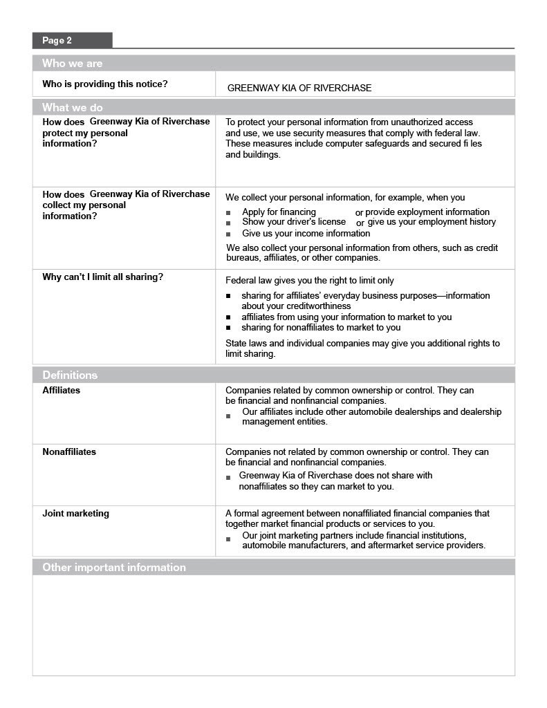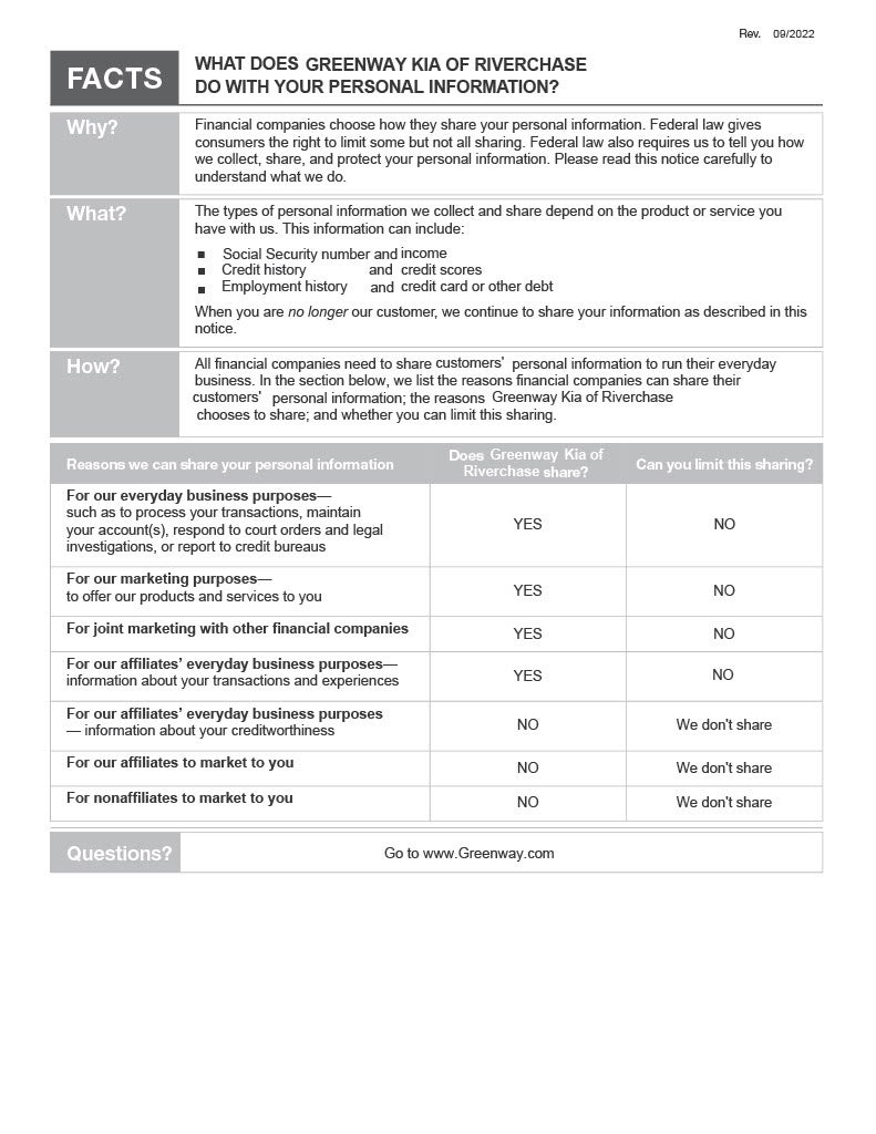 The Greenway Automotive Organization uses analytical data and the DoubleClick cookie to serve ads based on a user's prior visits to our website. Site visitors may opt out of the DoubleClick cookie by visiting the Google advertising opt-out page or they may opt out of Google analytics by visiting the Google analytics opt-out page. Please visit Google to obtain additional information about their Remarketing Privacy Guidelines, Policies, and Restrictions.