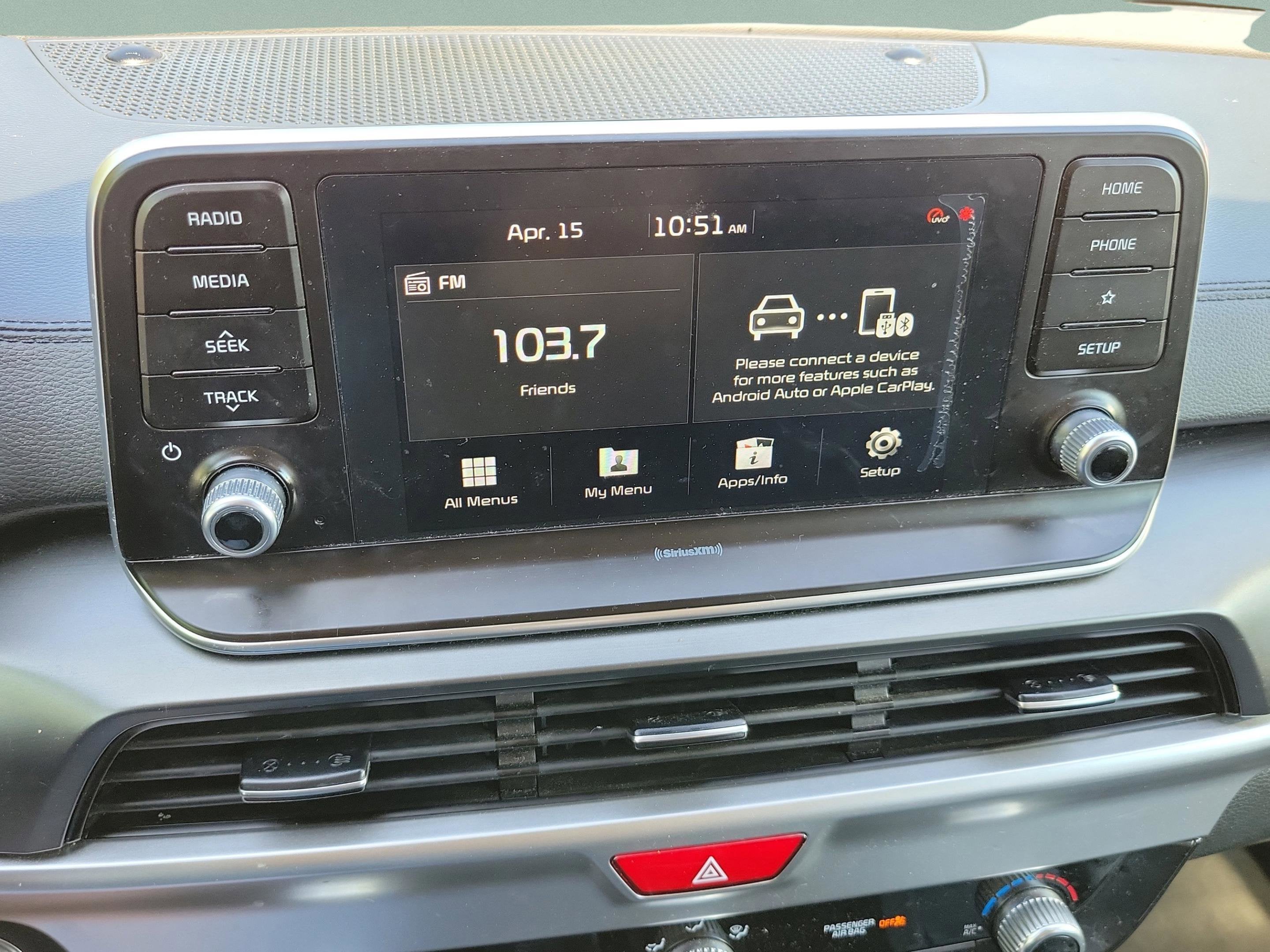 - Radio: AM/FM/MP3/SiriusXM Audio System -inc: UVO link infotainment system, w/smartphone integration for remote commands and remote vehicle status, 6-speaker, support for Android Auto and Apple CarPlay, 8" touch-screen color display, a total of 5 USB charge ports in all rows and Bluetooth® wireless connectivity w/voice recognition (a Bluetooth® enabled cell phone is required to use Bluetooth® wireless technology), Note: Remote's climate feature is not available on LX and S trim levels due to manual HVAC system